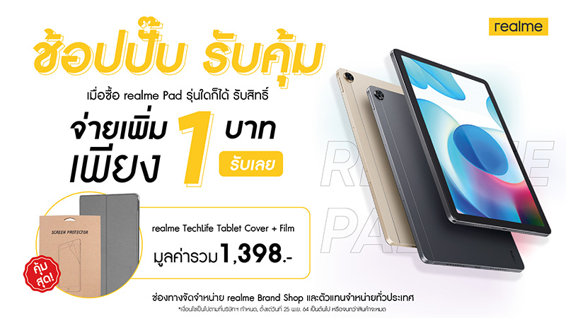 โปรพิเศษสุดปัง “ช้อปปั๊บ รับคุ้ม” ซื้อ realme Pad ทุกรุ่น เพิ่มเงิน 1 บาท รับเคสสุดหรูและฟิลม์กันรอย
