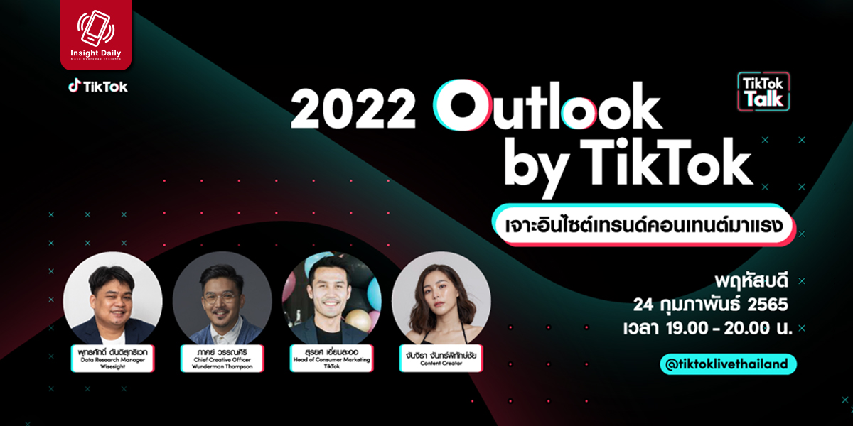 ห้ามพลาด พบกับ 2022 Outlook by TikTok เจาะอินไซต์เทรนด์คอนเทนต์มาแรง ในวันพฤหัสบดีที่ 24 กุมภาพันธ์นี้ เวลา 19.00 น. – 20.00 น. รับชมผ่านทาง @tiktoklivethailand เท่านั้น!