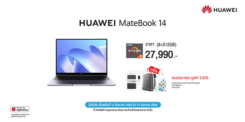 ใครที่ปักหมุดแล้วว่าอยากจัดแล็ปท็อปใหม่เจ๋งๆ สักตัวมาประดับโต๊ะทำงาน เพื่อยกระดับประสิทธิภาพการทำงานให้ตอบโจทย์ยุค Work From Home แบบนี้ก็ลองพิจารณา HUAWEI MateBook 14 ไว้เป็นหนึ่งในตัวเลือกที่จะทำให้เรารอดพ้นสมรภูมิงานไปด้วยกัน โดยเฉพาะล่าสุดนี้ HUAWEI MateBook 14 ที่มากับชิปเซ็ต AMD R5 (รุ่น 8GB DDR4+512GB PCIe NVMe SSD) กำลังจัดโปรโมชันฉลองวันแม่ที่ผ่านมากับราคา 27,990 บาท รับฟรีของแถมสุดคุ้ม Simple Home Gift Package 2 (ประกอบด้วย สเปรย์อเนกประสงค์ ผ้าเช็ดทำความสะอาด สมุดโน้ต) มูลค่า 1,290 บาท กระเป๋าเป้สะพาย มูลค่า 1,090 บาท และกระเป๋าผ้า มูลค่า 290 บาท รวมมูลค่า 2,670 บาท เมื่อสั่งซื้อตั้งแต่วันที่ 12 สิงหาคม 2564 ถึง 31 สิงหาคม 2564 หรือสั่งซื้อออนไลน์ได้แล้ววันนี้ที่ HUAWEI Online Store และ Shopee รวมทั้งช่องทาง HUAWEI Experience Store และร้านค้าตัวแทนจำหน่ายที่ร่วมรายการ