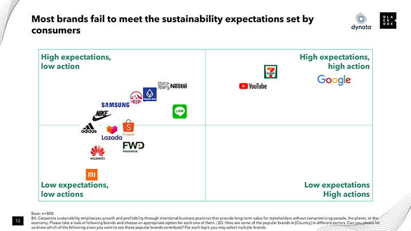 การศึกษายังชี้ให้เห็นว่าแบรนด์ต่างประเทศมีการดำเนินงานด้านความยั่งยืนที่เหนือกว่าแบรนด์ในประเทศไทย โดยดัชนีความยั่งยืนของแบรนด์ 2 จากการสำรวจแสดงให้เห็นว่า Google (1.53) และ YouTube (1.33) เป็นผู้นำในการดำเนินงานด้านความยั่งยืน โดยมีเพียงธนาคารกรุงเทพและ LINE เป็นแบรนด์เอเชียที่มีคะแนนสูงกว่าค่าเฉลี่ยด้วยคะแนน 1.01 และ 1.06 ตามลำดับ