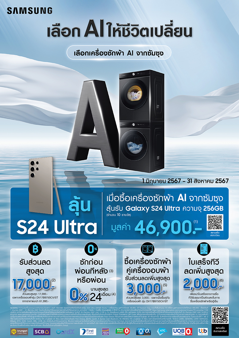 สัมผัสประสบการณ์การซักผ้าที่ดีที่สุดจากเครื่องซักและอบผ้า AI ของซัมซุงได้แล้ววันนี้ที่ร้านค้าชั้นนำทั่วประเทศ หรือสนใจดูรายละเอียดข้อมูลเพิ่มเติมได้ทาง www.samsung.com/th/washers-and-dryers