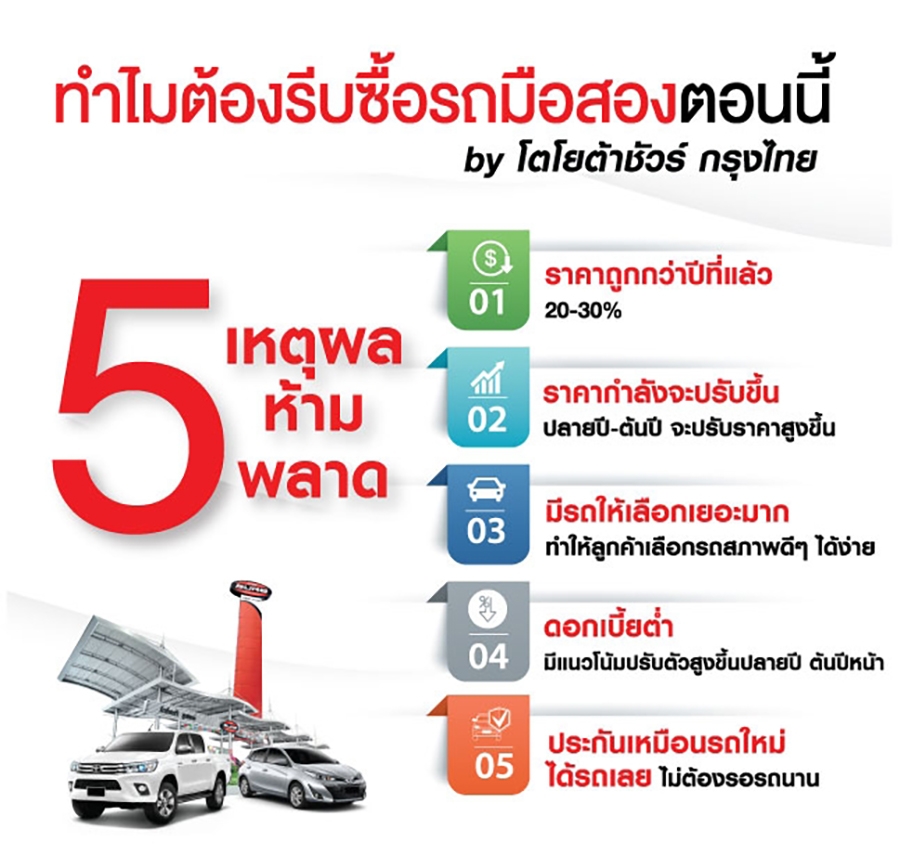 - มีรถสภาพเยี่ยมให้เลือกเพียบ — ช่วงนี้ตลาดรถมือสองมีรถสภาพดีให้ลูกค้าได้เลือกสรรมากมายหลายรุ่น ส่วนหนึ่งมาจากซัพพลายที่กลับมาเพราะรถที่ยึดมาจากไฟแนนซ์เริ่มทยอยเข้าตลาด โดย “โตโยต้า ชัวร์ กรุงไทย” ชี้ว่าในตลาดตอนนี้มีรถจำนวนมากทุกรุ่น ทุกยี่ห้อ ถือเป็นการเพิ่มตัวเลือกให้ลูกค้า ซึ่งลูกค้าบุคคลและองค์กรสามารถใช้บริการซื้อรถจากผู้จำหน่ายรถมือสองที่ได้มาตรฐานเพื่อรับบริการที่สะดวกสบายและน่าเชื่อถือ พร้อมบริการหลังการขายที่ครบวงจร เพื่อความอุ่นใจในทุก ๆ ขั้นตอนของการซื้อรถมือสองนั่นเอง