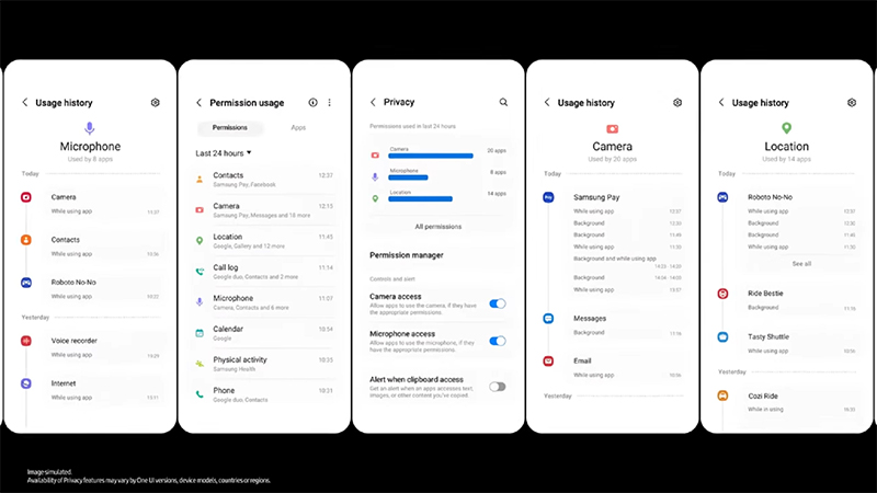 อีกทั้ง ยังใช้งานได้อย่างสบายใจไม่ต้องกังวลว่าแอปฯ ไหนจะสะกดรอยด้วย OneUI 4.0 ใน Galaxy S22 Series ที่มาพร้อมกับหมวดการตั้งค่า ความเป็นส่วนตัว (Privacy) ที่ผู้ใช้สามารถเช็คได้ทันทีว่ามีแอปพลิเคชันไหนเปิดใช้งานกล้อง ไมโครโฟน หรือโลเคชั่นอยู่บ้าง และสามารถเลือกอนุญาตหรือปฏิเสธการเข้าถึงจากแต่ละแอปฯ แม้กระทั่งปฏิเสธการเข้าถึงทุกแอปพลิเคชันก็ทำได้อย่างง่ายดายในเมนูเดียว
