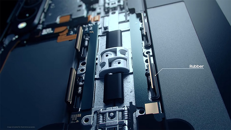 สำหรับวงการสมาร์ทโฟน หนึ่งในฟีเจอร์หลักที่ผู้คนคาดหวังคือ ความสามารถในการ ‘ทนน้ำ’ ซึ่งสำหรับสมาร์ทโฟนรูปทรงปกติ การป้องกันน้ำไม่ให้เข้าถึงอุปกรณ์ถือว่าทำได้ไม่ยากนัก แต่ Galaxy Z Fold3 5G นั้น ได้รับการพัฒนาขึ้นจากชิ้นส่วนหลักถึง 3 ส่วน ได้แก่ ตัวเครื่อง (Body) 2 ส่วน และบานพับ (Hinge) 1 ส่วน โดยมีการเดินสายไฟลอดผ่านบานพับเพื่อเชื่อมต่อการทำงานระหว่างตัวเครื่องทั้งสองส่วนเข้าด้วยกัน ซึ่งการปกป้องบานพับจากน้ำที่อาจเข้าไปในเครื่องขณะผู้ใช้พับหรือกางหน้าจอถือเป็นเรื่องท้าทายอย่างยิ่ง
