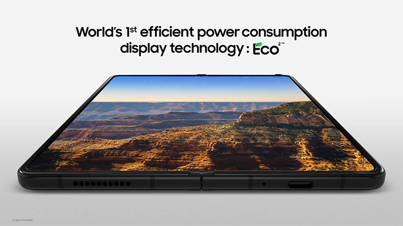 คำว่า Eco2™ (Eco Square) มีที่มาจากคุณสมบัติในเรื่อง ‘การใช้พลังงานอย่างมีประสิทธิภาพ (Efficient power Consumption) รวมกับคำว่า ‘ส่วนประกอบที่เป็นมิตรต่อสิ่งแวดล้อม (Eco-friendly Component) เทคโนโลยีนี้ปรากฏขึ้นเป็นครั้งแรกใน Galaxy Z Fold3 5G เพื่อให้ผู้ใช้ได้ดื่มด่ำกับประสบการณ์การรับชมคอนเทนต์ได้อย่างลื่นไหลและรวดเร็วผ่านเทคโนโลยี 5G บนหน้าจอแสดงผลขนาดใหญ่แบบไดนามิกใหม่ที่ใช้พลังงานแบตเตอรี่น้อยลง แต่เพิ่มความสว่างหน้าจอมากขึ้นถึง 29% ทั้งนี้ เนื่องจากชั้นโพลาไรเซอร์ทำจากแผ่นพลาสติก การเปลี่ยนมาใช้ Eco2™ จึงนับเป็นการลดพลาสติกเพื่อทำให้ผลิตภัณฑ์เป็นมิตรกับสิ่งแวดล้อมมากขึ้น ซึ่งถือเป็นความก้าวหน้าครั้งสำคัญในการพัฒนาเทคโนโลยีพลังงานต่ำของซัมซุง