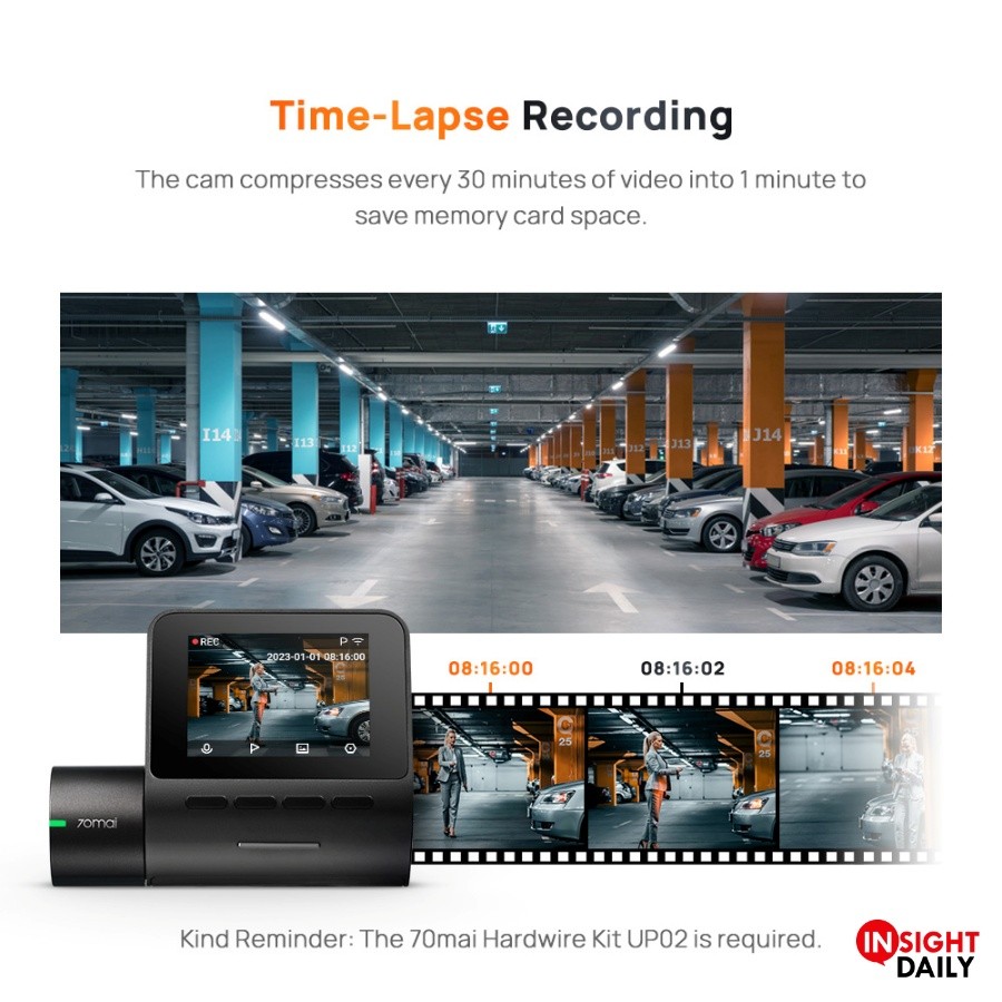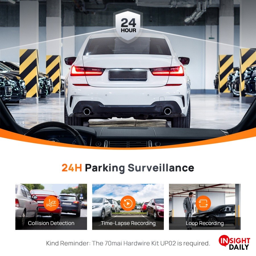 โดยฟุตเทจทุก 30 นาทีจะถูกบีบอัดเป็น 1 นาที เพื่อประหยัดพื้นที่ในการจัดเก็บข้อมูล (ระบบการทำงานและบันทึก parking mode จะทำงานเมื่อติดตั้งอุปกรณ์เสริมชุ Hardwire kit UP02) และยังรองรับการเชื่อมต่อแอป 70mai บนโทรศัพท์มือถือ ผ่าน Wifi โดยสามารถตั้งค่า ควบคุม และจัดการกล้อง