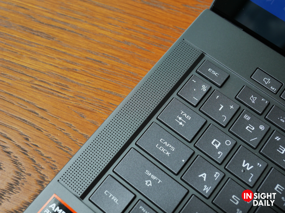 ROG Zephyrus G14 (2025) GA403 มีคีย์บอร์ดขนาด 75% พร้อมไฟ Aura RGB ทั้งนี้ปุ่มคีย์แคปถูกออกแบบให้มีขนาดใหญ่กว่าปกติ จึงให้ฟีลสัมผัส ตอบสนองเร็ว มีเสียงรบกวนต่ำ จึงเหมาะกับทั้งเล่นเกมและทำงาน