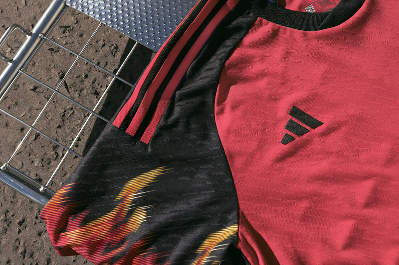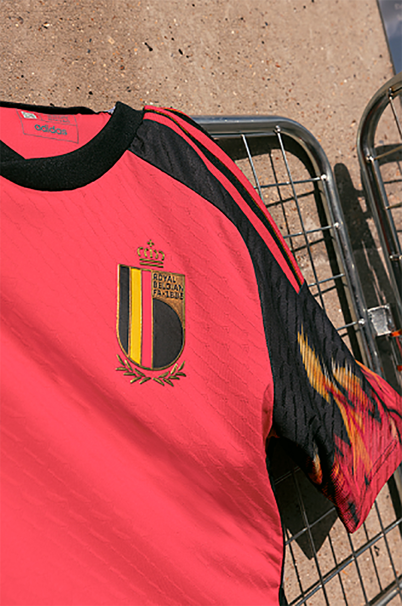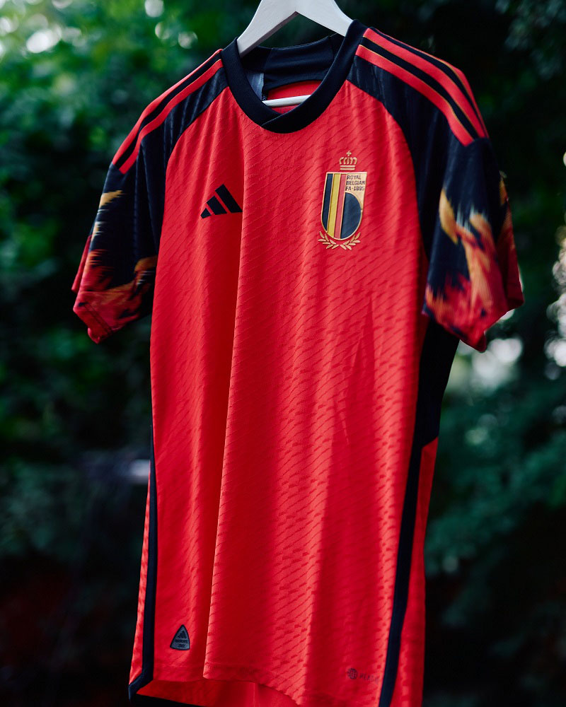 เสื้อแข่งขันเหย้าของทีมชาติเบลเยียม มีการใช้สีแดงเป็นหลักและตกแต่งรายละเอียดต่างๆ บนเสื้อด้วยสีดำและสีเหลือง เพื่อแสดงถึงสีของธงชาติเบลเยียม บริเวณแขนเสื้อทั้งสองข้างมีการตกแต่งด้วยลวดลายเปลวไฟที่สื่อถึงปิศาจและข่มขวัญทีมคู่แข่งในขณะแข่งขันกับทีมชาติเบลเยียม
