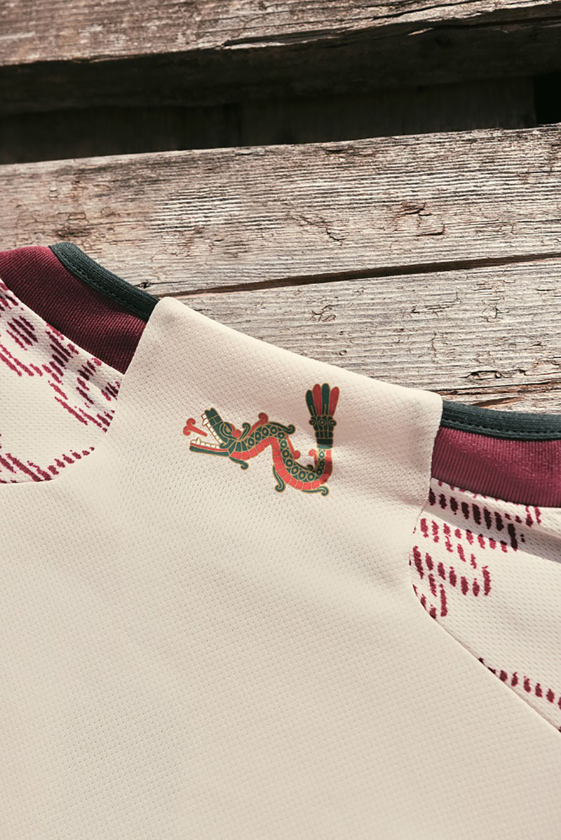 เสื้อแข่งขันเยือนของทีมชาติเม็กซิโก ได้รับอิทธิพลมาจากอารยธรรมโบราณ และมีการใช้ศิลปะ Mixtec แสดงถึงจิตวิญญาณนักสู้ของทีม ทั้งนี้ นอกเหนือจากลวดลายอันสะดุดตาที่อยู่ทั่วบริเวณตัวเสื้อแล้ว ยังมีการติดรูปงู Quetzalcoat ไว้ที่บริเวณคอเสื้อ เพื่อแสดงถึงพลังความสามารถของมวลมนุษยชาติอีกด้วย