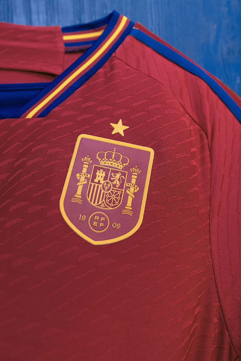 เสื้อแข่งขันเหย้าของทีมชาติสเปน ถูกออกแบบจากตัวตนด้านการเล่นฟุตบอลอันเป็นเอกลักษณ์ มีการใช้สีแดงเข้มที่มีความโดดเด่นเหนือกาลเวลา ประดับด้วยแถบสีจากธงชาติสเปนที่บริเวณคอเสื้อและด้านข้างลำตัว ส่วนเสื้อแข่งขันเยือนก็มีลวดลายที่ได้แรงบันดาลใจมาจากโลโก้ของทีมชาติเมื่อปี 1982 ซึ่งสเปนได้เป็นเจ้าภาพจัดการแข่งขันฟุตบอลโลกในปีนั้น
