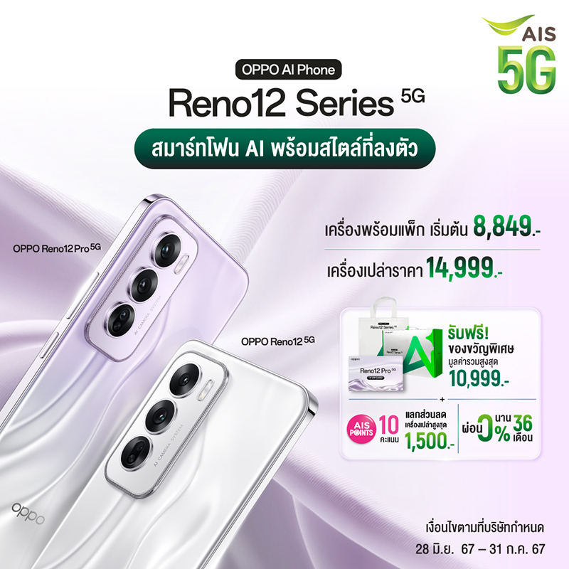 OPPO จับมือ AIS มอบโปรโมชันสุดพิเศษ OPPO Reno12 Series 5G รุ่นใหม่ ราคาเริ่มต้น 8,849 บาท