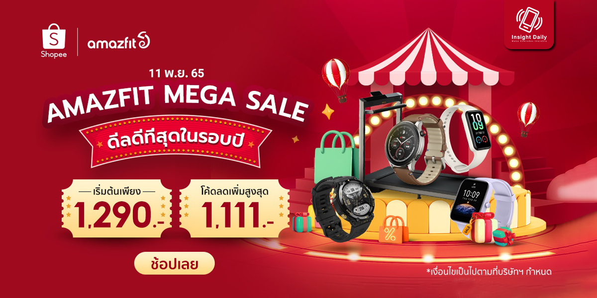 Amazfit แบรนด์อุปกรณ์สวมใส่อัจฉริยะชั้นนำระดับโลกในเครือ Zepp (NYSE: ZEPP) ประสบความสำเร็จอย่างสูงในกลุ่มสมาร์ทวอทช์ มาพร้อมกับแคมเปญสุดพิเศษขอบคุณลูกค้า 11.11 AMAZFIT MEGA SALE เริ่มต้นเพียง 1,290 บาท, คูปองลดสูงสุด 1,111 บาท, ซื้อ 2 ชิ้น ลด 3%