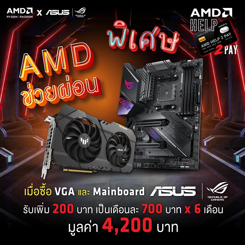 - พิเศษ! สำหรับผู้ที่ซื้อกราฟิกการ์ดและเมนบอร์ดแบรนด์ ASUS รับฟรี! สิทธิในการให้ AMD ช่วยผ่อนเพิ่มอีกเดือนละ 200 บาท เป็นมูลค่าทั้งสิ้นเดือนละ 700 บาท ระยะเวลา 6 เดือน
