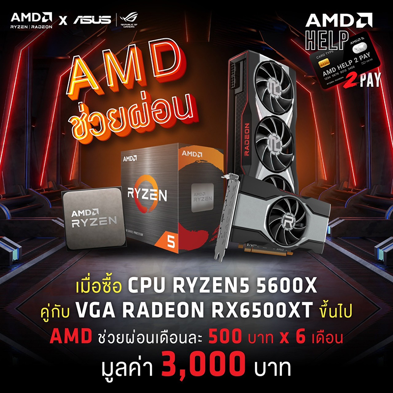 - เมื่อซื้อโปรเซสเซอร์ AMD Ryzen 5 5600X คู่กับกราฟิกการ์ด Radeon RX6500XT ขึ้นไป รับฟรี! สิทธิในการให้ AMD ช่วยผ่อนเดือนละ 500 บาท เป็นระยะเวลา 6 เดือน