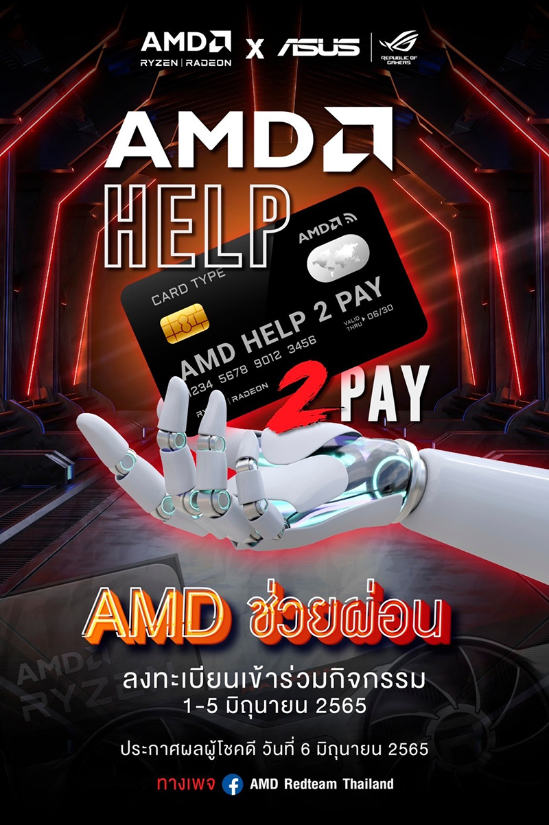 โปรโมชั่น “AMD Help2Pay” ที่จะมาช่วยผ่อนคอมพิวเตอร์ให้กับคุณสูงสุดถึง 4,200 บาท/เครื่อง สำหรับผู้ที่ซื้อผลิตภัณฑ์คอมพิวเตอร์ที่ใช้ขุมพลังโปรเซสเซอร์และกราฟิกการ์ด AMD ตามรุ่นที่กำหนด