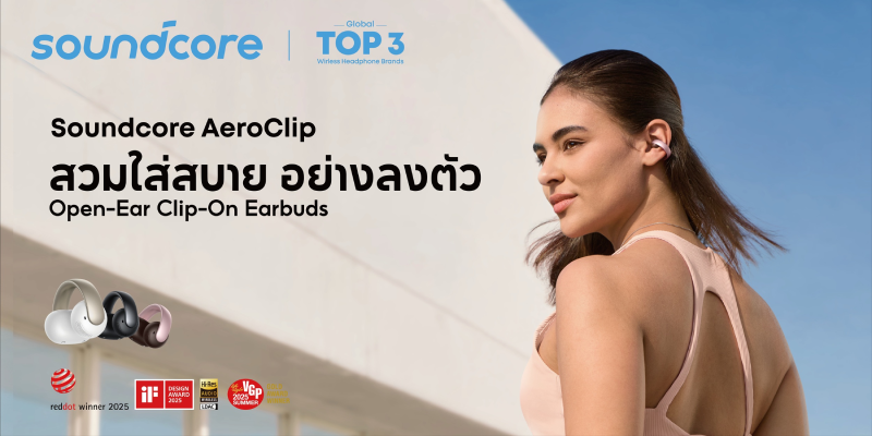 Soundcore AeroClip มอบความสบายตลอดวันด้วยช่องกำเนิดเสียงที่มีขนาดเล็กลงถึง 37% [3] และดีไซน์โค้งตามหลักสรีรศาสตร์ 5 องศา โครงสร้างแบบวงแหวนเปิดที่ยืดหยุ่นสามารถปรับเข้ากับทุกขนาดใบหู พร้อมกระจายแรงกดอย่างสมดุล ขณะที่เทคโนโลยีเสียงเบสเสมือนช่วยให้เสียงต่ำมีมิติและเป็นธรรมชาติ ผลิตภัณฑ์นี้ได้รับความนิยมในกลุ่มคนรุ่นใหม่ของไทย โดยนักแสดงและนักร้อง “เตนล์” ได้โชว์ AeroClip บน Instagram ซึ่งสะท้อนถึงภาพลักษณ์ที่ทันสมัยและมีสไตล์