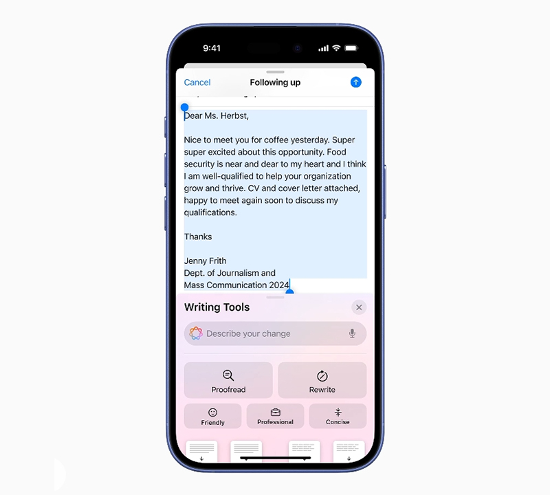 Apple Intelligence ปลดล็อควิธีการใหม่ๆ ให้ผู้ใช้ปรับปรุงการเขียนของตัวเองด้วยเครื่องมือการเขียนที่ครอบคลุมทั่วทั้งระบบ ซึ่งช่วยให้ผู้ใช้สามารถปรับการเขียน พิสูจน์อักษร และสรุปเนื้อหาของข้อความได้ ส่วนการสื่อสารและการแสดงออกถึงความเป็นตัวเองก็กลายเป็นเรื่องที่สนุกยิ่งขึ้น ด้วยความสามารถในการสร้าง Genmoji ที่ไม่ซ้ำใครและ Image Playground ที่ช่วยให้ผู้ใช้สร้างรูปภาพสนุกๆ ได้อย่างรวดเร็ว นอกจากนี้ Apple Intelligence ยังช่วยสรุปการแจ้งเตือน รวมถึงแสดงข้อความที่สำคัญต่อเวลาด้วยคุณสมบัติข้อความที่มีความสำคัญในแอปเมล ผู้ใช้สามารถบันทึก ถอดข้อความ และสรุปเนื้อหาจากเสียงได้ในแอปโน้ตและโทรศัพท์ โดยเมื่อมีการเริ่มบันทึกเสียงในแอปโทรศัพท์ในขณะที่ผู้ใช้คุยโทรศัพท์ ผู้ที่อยู่ในสายจะได้รับการแจ้งเตือนโดยอัตโนมัติ และเมื่อวางสาย Apple Intelligence ก็จะสรุปเนื้อหาเพื่อช่วยทบทวนประเด็นสำคัญ