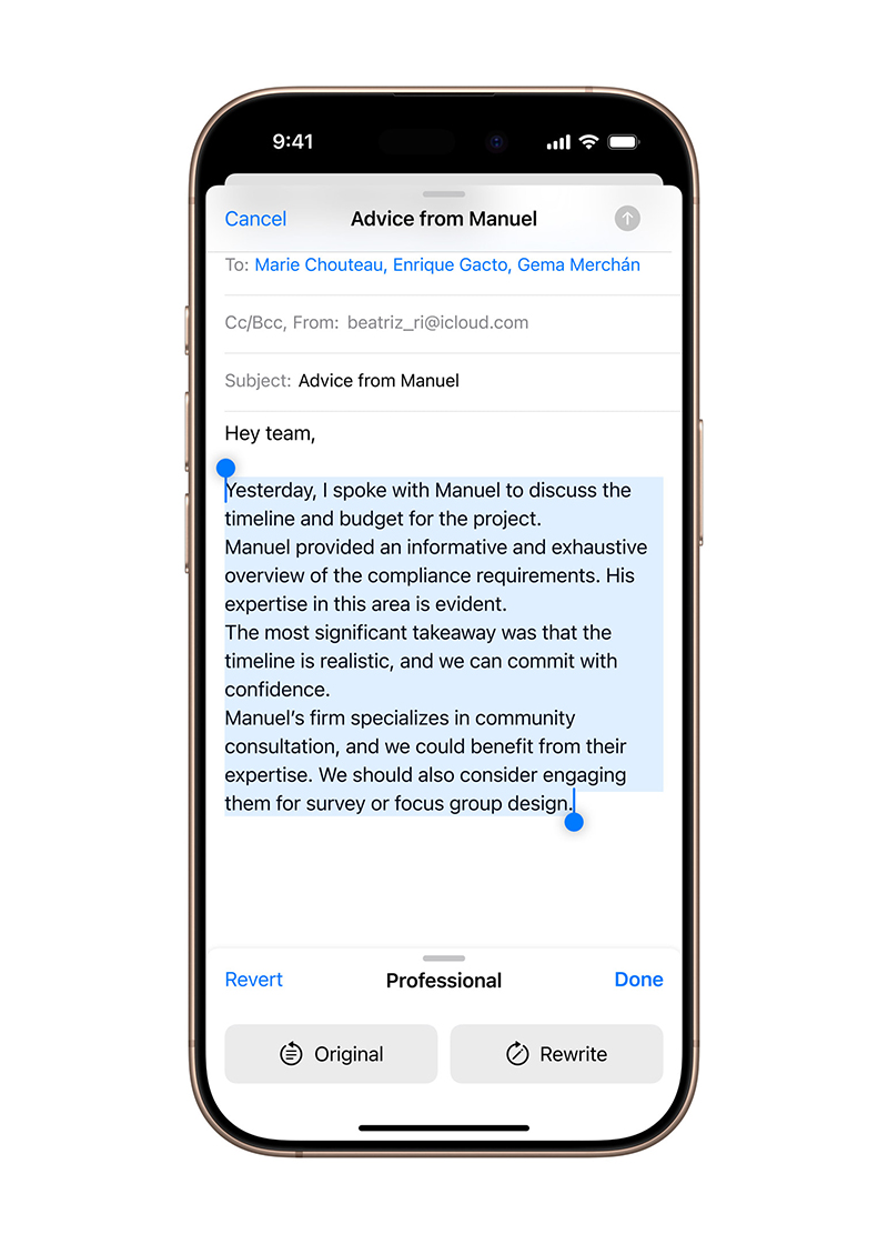 Apple Intelligence ปลดล็อควิธีการใหม่ๆ ให้ผู้ใช้ปรับปรุงการเขียนของตัวเองด้วยเครื่องมือการเขียนที่ครอบคลุมทั่วทั้งระบบ ซึ่งช่วยให้ผู้ใช้สามารถปรับการเขียน พิสูจน์อักษร และสรุปเนื้อหาของข้อความได้ ส่วนการสื่อสารและการแสดงออกถึงความเป็นตัวเองก็กลายเป็นเรื่องที่สนุกยิ่งขึ้น ด้วยความสามารถในการสร้าง Genmoji ที่ไม่ซ้ำใครและ Image Playground ที่ช่วยให้ผู้ใช้สร้างรูปภาพสนุกๆ ได้อย่างรวดเร็ว นอกจากนี้ Apple Intelligence ยังช่วยสรุปการแจ้งเตือน รวมถึงแสดงข้อความที่สำคัญต่อเวลาด้วยคุณสมบัติข้อความที่มีความสำคัญในแอปเมล ผู้ใช้สามารถบันทึก ถอดข้อความ และสรุปเนื้อหาจากเสียงได้ในแอปโน้ตและโทรศัพท์ โดยเมื่อมีการเริ่มบันทึกเสียงในแอปโทรศัพท์ในขณะที่ผู้ใช้คุยโทรศัพท์ ผู้ที่อยู่ในสายจะได้รับการแจ้งเตือนโดยอัตโนมัติ และเมื่อวางสาย Apple Intelligence ก็จะสรุปเนื้อหาเพื่อช่วยทบทวนประเด็นสำคัญ