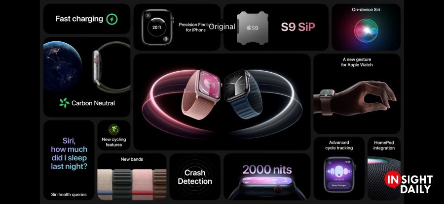 Apple เปิดตัว Apple Watch Series 9 โดยนำความสามารถ ใหม่ๆ มาสู่นาฬิกาที่ขายดีที่สุดในโลก และทำตามหมุดหมายสำคัญด้านสิ่งแวดล้อมได้สำเร็จ Apple Watch Series 9 ทรงพลังยิ่งกว่าเคยด้วย SiP รุ่น S9 ใหม่ ซึ่งมาพร้อมประสิทธิภาพและความสามารถที่เพิ่มขึ้น, คำสั่งนิ้ว “แตะสองครั้ง” ใหม่อันน่าทึ่ง, จอภาพที่สว่างขึ้น, Siri บนอุปกรณ์ที่เร็วขึ้น, ความสามารถใหม่ในการเข้าถึงและบันทึกข้อมูลสุขภาพ ตลอดจนคุณสมบัติค้นหาตำแหน่งที่ตั้งจริงสำหรับ iPhone และอีกมากมาย