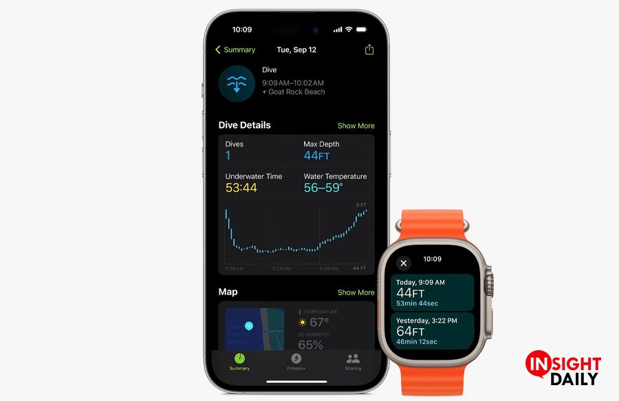 Apple Watch Ultra เหมาะที่สุดสำหรับกีฬาทางน้ำ รวมถึงกิจกรรมเอ็กซ์ตรีมต่างๆ อย่างไคท์เซิร์ฟและเวคบอร์ด และการดำน้ำสกูบาเชิงนันทนาการถึงความลึก 40 เมตรด้วยแอป Oceanic+ ที่ได้รับการอัปเดตจาก Huish Outdoors1 แอปความลึกที่มากับนาฬิกาสามารถบันทึกรายการของแต่ละเซสชั่น ผู้ใช้จึงสามารถดูเซสชั่นล่าสุดบน Apple Watch Ultra หรือดูประวัติแบบเต็มของการดำน้ำทุกครั้งได้ด้วยจุดป้อน GPS ในแอปฟิตเนสบน iPhone