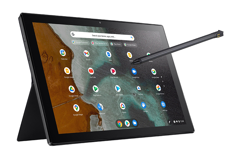 โครมบุ๊กถอดคีย์บอร์ดได้ ใช้งานได้ทั้งแนวตั้งและแนวนอน มาพร้อมปากกาสไตลัสและคีย์บอร์ดขนาดเต็ม ใช้งานได้หลากหลายโหมด พร้อมน้ำหนักเบา พกพาง่าย ตัวเครื่องสีเทา (Mineral Grey) ทำจากอลูมีเนียม บางเพียง 7.9 มม. มาพร้อมหน้าจอสัมผัสขนาด 10.5 นิ้ว อัตราส่วน 16:10 เหมาะสำหรับการใช้งานด้านการเรียน และความบันเทิง โดยสามารถใช้งานได้สูงสุดกว่า 12 ชั่วโมง