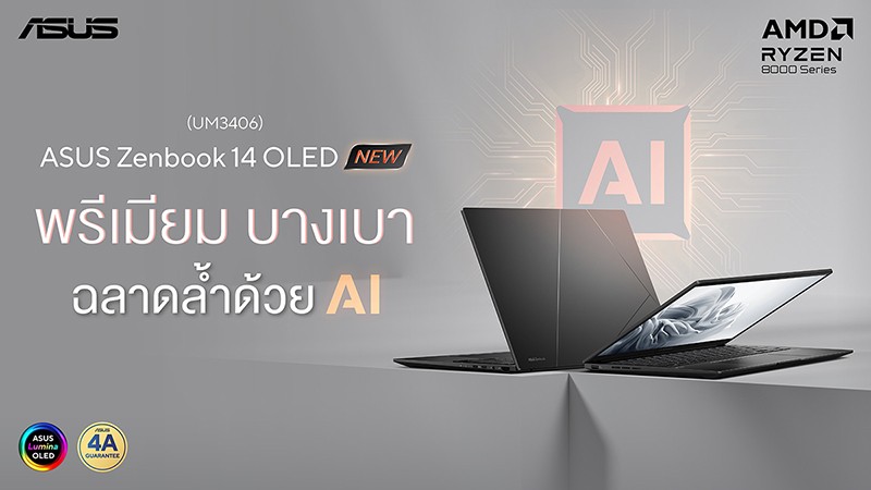 เอซุส (ประเทศไทย) เปิดตัวพร้อมวางจำหน่าย ASUS Zenbook 14 OLED (UM3406) โน้ตบุ๊กพรีเมียม บางเบา ในตระกูล Zenbook Classic Series น้ำหนักเพียง 1.2 กก. ใช้งานได้ยาวนานต่อเนื่องด้วยแบตเตอรี่ขนาด 75Wh ทำงานเต็มประสิทธิภาพด้วยโปรเซสเซอร์เรือธงรุ่นล่าสุด AMD Ryzen™ 7 8840HS ที่มาพร้อม AMD Ryzen AI Accelerator เพิ่มความสามารถในการใช้งาน AI ด้วยความเร็วสูงสุด 38 TOPs (ขยับจาก 10 TOPs จากชิปรุ่นก่อนหน้า)