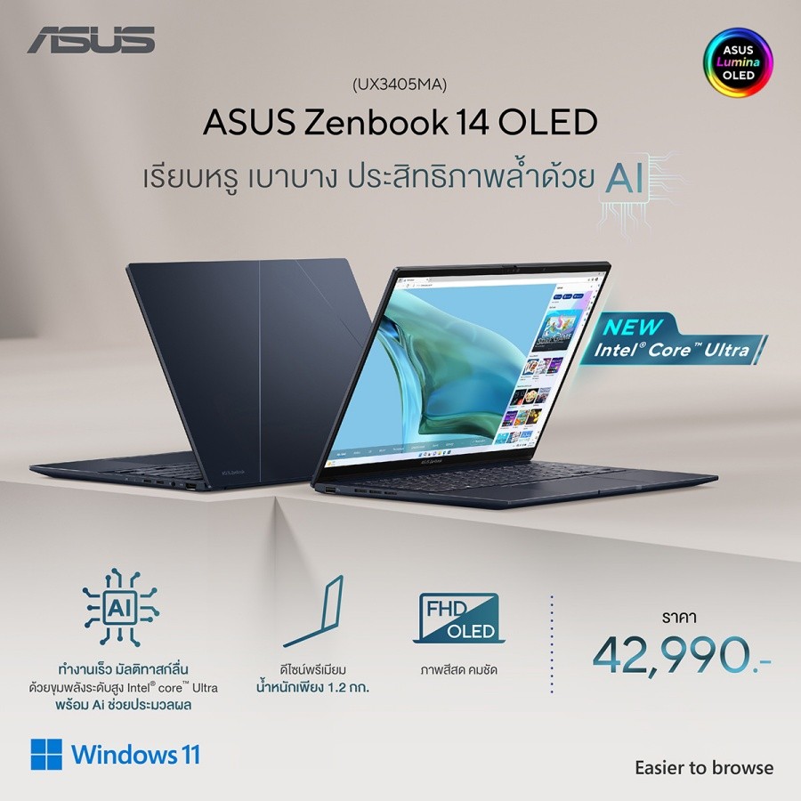 บริษัท เอซุส ประเทศไทย ประกาศพร้อมวางจำหน่ายผลิตภัณฑ์ ใหม่ของปี 2024 ครบทุกกลุ่มผลิตภัณฑ์โน้ตบุ๊ กเป็นแบรนด์แรกในประเทศไทย ตอบโจทย์ความต้องการใช้งานที่ หลากหลาย ไม่ว่าจะเป็น Zenbook 14 OLED (UX3405) พรีเมียมอัลตร้าบุ๊กรุ่นล่าสุ ดในตระกูล Zenbook Series Classic ชูจุดเด่นโปรเซสเซอร์รุ่นใหม่ล่ าสุดของปี 2024 อย่าง Intel® Core™ Ultra ที่ถูกเสริมประสิทธิภาพด้วยชิ ปประมวลผล AI ที่ถูกติดตั้งมาในตัวเครื่อง พร้อมวัสดุสุดพรีเมียมและมีน้ำ หนักเบาเพียง 1.2 กก.