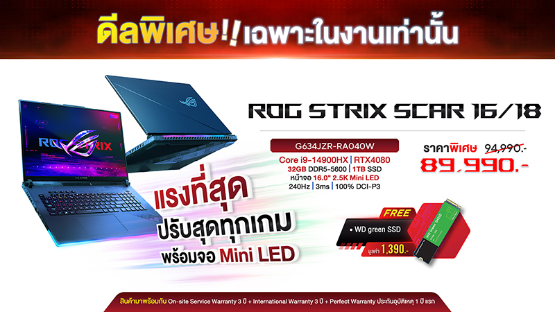 เลือกความเป็นที่สุดในทุกด้านของการเล่นเกมด้วย ROG Strix Scar Series ที่มีกราฟิกการ์ดระดับสูงสุดที่เป็นที่ใฝ่ฝันของเกมเมอร์สทุกคนอย่าง GeForce RTX 4090 (Max TGP 175W) พร้อมระบบระบายความร้อนที่ดีที่สุดในเวลานี้อย่าง ROG Intelligent Cooling ที่จะช่วยดึงประสิทธิภาพระดับสูงสุดของฮาร์ดแวร์ออกมาได้แบบไม่มีสะดุด รับส่วนลดสูงสุด 5,000 บาท สำหรับรุ่น ROG Strix Scar 16 (G634JZR-RA040W) ด้วยราคาเริ่มต้นเพียง 89,990 บาท พร้อมรับฟรี WD Green SSD ความจุ 500GB มูลค่า 1,390 บาท