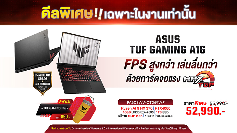 ส่วนรุ่นที่ 2 ได้แก่ ASUS TUF Gaming A16 (FA608WV-QT069WF) ที่มีซีพียู AMD Ryzen AI 9 HX 370 การ์ดจอ NVIDIA® GeForce RTX 4060 VRAM 8GB GDDR6 พร้อม MAX TGP 140W ที่ให้ประสิทธิภาพสูงกว่าและ FPS เยอะกว่า เล่นเกมได้ลื่นไหลยิ่งกว่า กับหน้าจอขนาด 16 นิ้ว ความละเอียด 2.5K รีเฟรชเรท 165Hz แบบ 100% sRGB และ NVIDIA G-SYNC ประสานอัตราการรีเฟรชหน้าจอกับการแสดงผลของการ์ดจอ ลดความหน่วง สนุกกับการเล่นเกมยิ่งขึ้น มาพร้อมดีไซน์ใหม่ของรุ่น TUF Gaming ที่ตัวเครื่องมีขนาดเล็กลงและกะทัดรัด ขอบจอบางเพียง 17.9 มม. และมีน้ำหนัก 2.2 กก. ราคาพิเศษ 52,990 บาท จากปกติ 55,990 บาท และแถมแก้วน้ำเก็บความเย็น TUF Gaming Flask มูลค่า 890 บาท ฟรี!