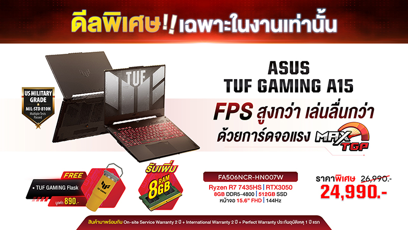 สำหรับเกมมิ่งโน้ตบุ๊กรุ่นเริ่มต้น ขอแนะนำจำนวน 2 รุ่น ได้แก่ ASUS TUF Gaming A15 (FA506NCR-HN007W) ด้วยขุมพลังซีพียู AMD Ryzen 7 7435HS การ์ดจอ NVIDIA® GeForce RTX 3050 VRAM 4GB GDDR6 พร้อม MAX TGP 75W หน้าจอขนาด 15.6 นิ้ว ความละเอียด FHD รีเฟรชเรท 144Hz โดยโปรโมชันภายในงาน ลดราคาเหลือ 24,990 บาท (จากเดิม 26,990 บาท) รวมทั้งแถม! RAM เพิ่มอีก 8GB DDR5-4800 MHz ณ จุดจำหน่าย รวมเป็น 16GB อีกทั้งของแถมจะได้รับแก้วน้ำเก็บความเย็น TUF Gaming Flask มูลค่า 890 บาท ฟรี!