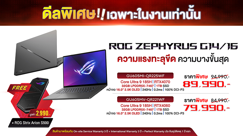 เป็นเจ้าของเกมมิ่งโน้ตบุ๊กที่ให้ได้ทั้งประสิทธิภาพระดับสูงและดีไซน์ที่พรีเมียมบางเบาอย่างที่หาจากรุ่นอื่นไม่ได้กับ ROG Zephyrus G16 โดดเด่นด้วยดีไซน์เรียบหรูแต่ยังคงไว้ซึ่งความโฉบเฉี่ยวตามสไตล์ ROG วัสดุตัวเครื่องแข็งแกร่งด้วยอลูมิเนียมที่ผ่านกระบวนการ CNC อันปราณีต ได้ความบางตัวเครื่องสูงสุด 1.49 ซม. และน้ำหนักเพียง 1.85 กก. เพื่อความคล่องตัวในการพกพาที่เหนือชั้นยิ่งกว่า หน้าจอแสดงผลที่ยอดเยี่ยมที่สุดเท่าที่จะเป็นไปได้อย่าง ROG Nebula Display HDR ขนาดใหญ่เต็มตาถึง 16 นิ้ว ให้ความละเอียดสูงถึง 2.5K (QHD+) ด้วยเทคโนโลยีแบบ OLED จึงทำให้ได้สีดำที่ดำสนิทและสีสันสมบูรณ์แบบสำหรับการทำงานระดับมืออาชีพ แรงลื่นไหลด้วยโปรเซสเซอร์ Intel Core Ultra 9 185H ที่มี NPU สำหรับการประมวลผล AI ในตัว จับคู่กับกราฟิกการ์ดไฮเอนด์อย่าง GeForce RTX 4070 ในรุ่น GU605MI-QR225WF หรือ GeForce RTX 4060 ในรุ่น GU605MV-QR221WF รับส่วนลดสำหรับ ROG Zephyrus Series สูงสุด 5,000 บาท ด้วยราคาเริ่มต้นเพียง 49,990 บาท พร้อมรับฟรี SSD แบบพกพาขนาดความจุ 500GB ROG Strix Arion S500 มูลค่า 2,990 บาท