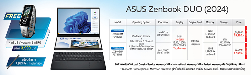 เอซุสยังมีโปรโมชันสุดพิเศษ ส่วนลดสูงสุด 10,000 บาท สำหรับ ASUS Zenbook DUO 2024 (UX8406) โน้ตบุ๊กสองหน้าจอสุดล้ำขนาด 14 นิ้ว มาพร้อมขาตั้งในตัวและคีย์บอร์ดที่ถอดแยกได้ ทำให้ใช้งานได้หลากหลายโหมด ไม่ว่าจะเป็นแบบโน้ตบุ๊กดั้งเดิม ขนาดจอ 14 นิ้ว อัตราส่วน 16:10, แบบหน้าจอคู่ เพิ่มเนื้อที่การใช้งานได้สูงสุด 19.8 นิ้ว, โหมดเดสก์ท๊อป สำหรับผู้ที่เน้นการใช้งานข้อมูล และโหมดแชร์หน้าจอ (กาง 180 องศา) เหมาะกับการพรีเซ้นต์งาน ช่วยให้ใช้งานมัลติทาสก์ได้อย่างยอดเยี่ยม ให้คุณเป็นเจ้าของได้ในราคาเริ่มต้นเพียง 57,990 บาท จากปกติ 67,990 บาท พร้อมรับเพิ่ม ASUS Vivowatch 5 AERO มูลค่า 3,990 บาท