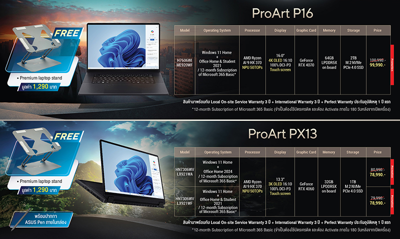ProArt P16 (H7606) มาพร้อมหน้าจอขนาด 16 นิ้ว ความละเอียด 4K, การ์ดจอ NVIDIA GeForce RTX 4070, RAM 64GB LPDDR5X on board และหน่วยเก็บข้อมูลขนาด 2TB M.2 NVMe™ PCIe® 4.0 SSD ตอบโจทย์นักสร้างสรรค์ที่ต้องใช้เนื้อที่ในการจัดเก็บไฟล์ภาพและวีดีโอขนาดใหญ่ พิเศษ! ราคา 99,990 บาท จากราคาปกติ 100,900 บาท และรับเพิ่มแท่นวางโน้ตบุ๊ก มูลค่า 1,990 บาท สำหรับนักสร้างสรรค์ที่เน้นการใช้งานนอกสถานที่ ขอแนะนำ ProArt PX13 ครีเอเตอร์โน้ตบุ๊กขนาด 13.3 นิ้ว สามารถพับหน้าจอได้ 360 องศา ใช้งานได้หลากหลายโหมด ขับเคลื่อนด้วยโปรเซสเซอร์ AMD Ryzen AI 9 HX 370 และการ์ดจอ NVIDIA GeForce RTX 4060 ราคาพิเศษ 78,990 บาท จากปกติ 79,990 บาท พร้อมรับเพิ่มแท่นวางโน้ตบุ๊ก มูลค่า 1,990 บาท