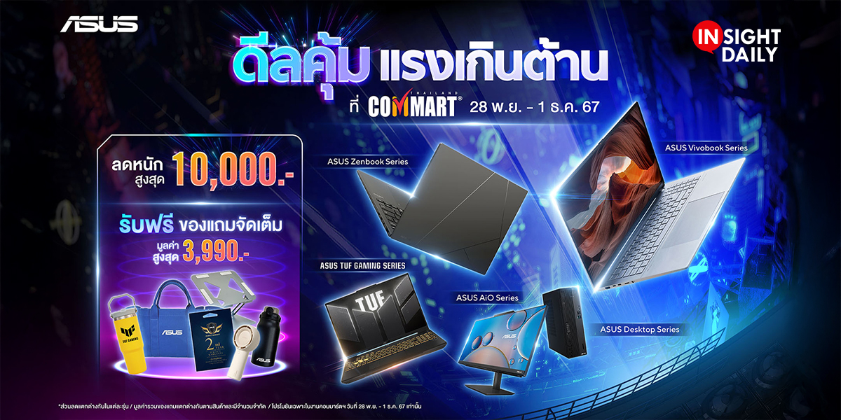 เอซุส (ประเทศไทย) และ รีพับลิก ออฟ เกมเมอร์ส (ROG) ส่งโปรโมชันพิเศษส่งท้ายปี ชวนคุณร่วมสัมผัสนวัตกรรมโน้ตบุ๊ก AI พร้อมรับส่วนลดอัดแน่น สูงสุดกว่า 10,000 บาทในงาน “COMMART TechXPro” ณ ศูนย์นิทรรศการและการประชุมไบเทค บางนา ระหว่างวันที่ 28 พฤศจิกายน – 1 ธันวาคม 2567 ยกทัพสินค้าใหม่ล่าสุด ครอบคลุมทั้งผลิตภัณฑ์โน้ตบุ๊ก, เกมมิ่งโน้ตบุ๊ก, ครีเอเตอร์โน้ตบุ๊ก, คอมพิวเตอร์เดสก์ท็อป และคอมพิวเตอร์ออลอินวัน (all-in-one) ชูโปรโมชันส่วนลดสูงสุด 10,000 บาท พร้อมของแถมสุดพิเศษมากมาย และโปรโมชันผ่อน 0% สูงสุด 10 เดือน!