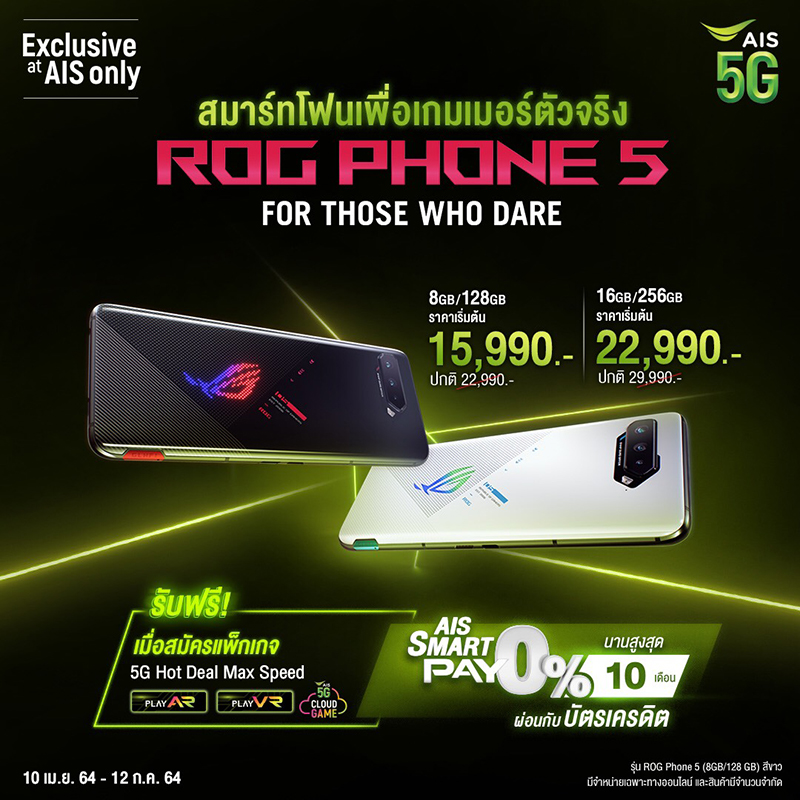 พร้อมมอบสิทธิพิเศษเฉพาะลูกค้า AIS สามารถซื้อสมาร์ตโฟน ROG Phone 5 ได้ในราคาพิเศษเริ่มต้นเพียง 15,990 บาท เมื่อซื้อพร้อมแพ็กเกจที่กำหนด