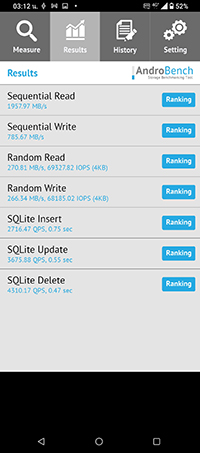 • ทดสอบประสิทธิภาพความเร็วการอ่าน-เขียนของหน่วยความจำด้วย AndroBench ได้ Sequential Read 1,957.97 MB/s และ Sequential Write 785.67 MB/s