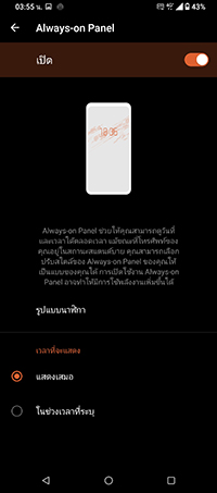 Always-on Panel เป็นฟีเจอร์สำหรับเรียกดูสถานะ เช่น วันที่ เวลา แบตเตอรี่ และการแจ้งเตือนต่าง ๆ ได้ แม้โทรศัพท์จะอยู่ในโหมดสแตนด์บายก็ตาม โดยมีรูปแบบให้เลือกปรับเปลี่ยนมากถึง 7 รูปแบบ