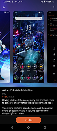 ธีมถือว่าเป็นอีกหนึ่งความพิเศษของ ASUS ROG Phone 5 ในครั้งนี้ โดยมีชุดธีมภาพเคลื่อนไหวใหม่ที่รองรับการแสดงผลวิดีโอหน้าจอล็อค (วิดีโอภาพเคลื่อนไหว), Always-on Display, การโทร (ภาพเคลื่อนไหว), ROG Vision และเอฟเฟกต์เสียงต่าง ๆ โดยสามารถเรียกการตั้งค่าได้ด้วยการปัดนิ้วลงจากด้านบนของหน้าจอเพื่อเข้าถึงการตั้งค่าด่วน เลือก “ธีม” > “ฉัน” > “ธีมของฉัน” แล้วเลือกธีมที่ต้องการ เช่น Akira-Futuristic infiltration ธีมไฮไลท์ที่มีมาให้ (เท่สุด ๆ) จากนั้นเลือก “นำไปใช้” แค่นี้ก็ได้ธีมสวย ๆ ไว้ใช้บนเครื่องแล้ว