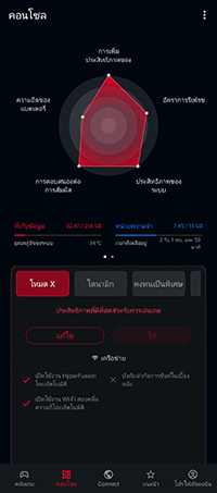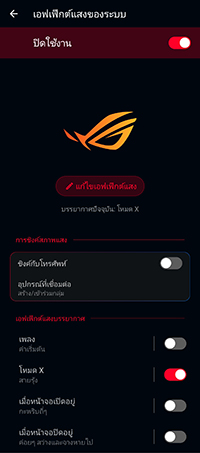 X Mode เป็นโหมดสำหรับช่วยเพิ่มประสิทธิภาพในการเล่นเกมบนตัวเครื่องโดยเฉพาะ เสมือนเป็นโหมดที่เอาไว้คัสตอมให้แรงขึ้นกว่าเดิม เช่น การตั้งค่าเครือข่าย – เปิดใช้งาน HyperFusion, บังคับการจำกัดการซิงค์ข้อมูลเบื้องหลัง, เปิดใช้งาน Wi-Fi สองคลื่นความถี่ พร้อมทั้งการเลือกความลื่นไหลของการแสดงผลหน้าจอ 60Hz / 120Hz / 144Hz) รวมไปถึงการเพิ่มความแม่นยำและความไวในการสัมผัสบนหน้าจอให้มากขึ้นด้วย โดยสามารถเข้าไปเซ็ตค่าผ่าน Armory Crate ได้เลยค่ะ ซึ่งเมื่อเราเปิดใช้งาน X Mode ธีมเครื่องจะเปลี่ยนเป็นสีแดง และเปิดไฟ RBG ด้านหลังเครื่องด้วย เท่มาก ๆ