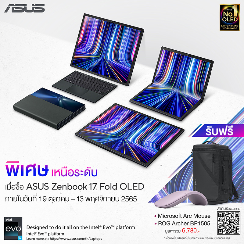 พิเศษ! เมื่อสั่งซื้อ ASUS Zenbook 17 Fold OLED ภายในวันที่ 19 ตุลาคม – 13 พฤศจิกายน 2565 ลงทะเบียนรับฟรี* Microsoft Arc Mouse และ ROG Archer BP1505 มูลค่ารวม 6,780 บาท ที่ th.asus.click/WmBrir