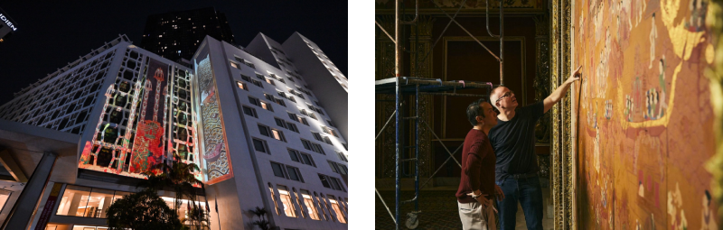 หนึ่งในไฮไลต์ของ Bangkok Design Week 2026 ณ โรงแรมมณเฑียร สุรวงศ์ กรุงเทพฯ คือ “Palace of Food and Cultures” นิทรรศการแสงแบบ Immersive Experience โดย แทนสกุล สุวรรณกูฏ (XD49) ครั้งแรกของวงการโรงแรมไทยที่นำแรงบันดาลใจจากจิตรกรรมฝาผนังของ ท่านกูฏ (ไพบูลย์ สุวรรณกูฏ) มาตีความใหม่ผ่านแสง สี Animation และ Live Interactive Arts บนผนังอาคารโรงแรม เปลี่ยนสถาปัตยกรรมระดับตำนานให้กลายเป็นผืนผ้าใบแห่งจินตนาการ ที่ผู้ชมมีส่วนร่วมกับงานศิลป์ได้แบบเรียลไทม์ เชื่อมโยงศิลปะไทยร่วมสมัย สถาปัตยกรรม และวัฒนธรรมอาหารเข้าด้วยกันอย่างมีชีวิตชีวา