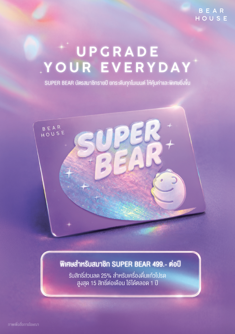 นอกจากนี้ ยังเตรียมยกระดับสิทธิประโยชน์สำหรับสมาชิก ด้วยฐานสมาชิกปัจจุบันที่มีมากกว่า 500,000 ราย ผ่านการเปิดตัวโปรแกรมสมาชิกใหม่ “SUPER BEAR” ในรูปแบบ Subscription รายปี มอบสิทธิพิเศษส่วนลด 25% สำหรับเครื่องดื่มทุกแก้ว (สูงสุด 15 แก้วต่อเดือน) โดยจะเริ่มจำหน่าย ตั้งแต่วันที่ 24 เมษายน 2569 เป็นต้นไป ที่ร้าน BEARHOUSE ทุกสาขา