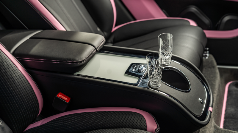 สำหรับ Bentayga EWB เฉดสีพิเศษ การตกแต่งภายนอกตัวถังได้ผสานเข้ากับภายในห้องโดยสารที่ตกแต่งด้วยหนังและด้ายเฉดสี Cherry Blossom พร้อมด้วยโลโก้แบรนด์รถยนต์เบนท์ลีย์ที่ปักลายบนเบาะโดยสาร โดยลูกค้าเลือกติดตั้งช่องเก็บความเย็น Mulliner Bottle Cooler ที่มากับฝากระจกฝ้าแบบ Soft Close ระหว่างเบาะโดยสารแบบ Airline Seat Specification ภายในห้องโดยสารเพื่อความสะดวกสบายสำหรับผู้โดยสารตอนหลัง