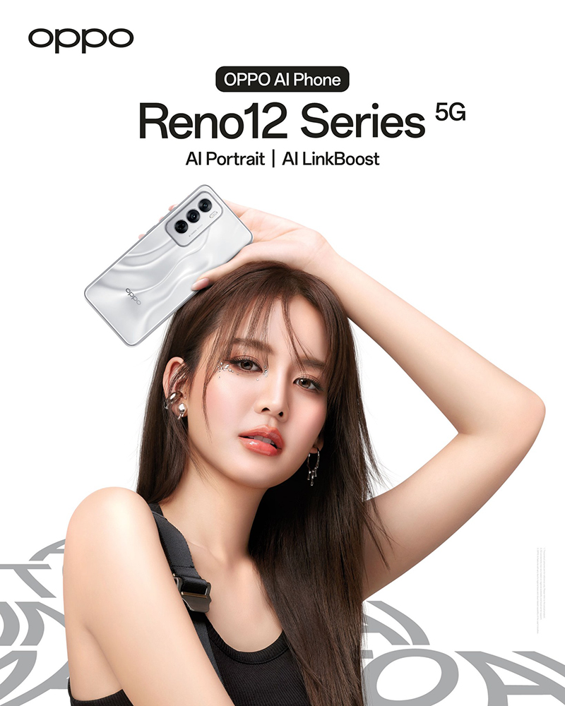 โปสเตอร์แรกจากออปโป้ “โบว์ เมลดา” มาในลุคแฟชั่นติดแกลมสุดเทรนดี้ นำเทรนด์ก่อนใครด้วยมือที่ถือสมาร์ตโฟน OPPO AI เครื่องแรกอย่าง “OPPO Reno12 Series 5G” ในดีไซน์สีเงินสุดชิค สวยโดดเด่น ล้ำสมัยไม่ซ้ำใครด้วยดีไซน์ไอคอนิคสุดเทรนดี้ กับฝาหลังเป็นลายริ้วคลื่นที่เรียกได้ว่าเป็นความงามที่ได้รับแรงบันดาลใจจากโลกอนาคตอย่างแท้จริง