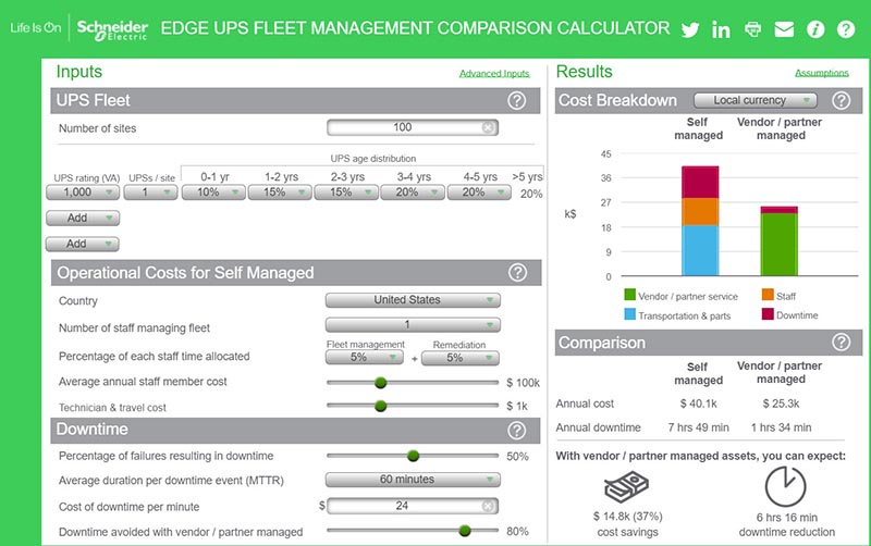แม้เครื่องมือ TradeOff ใหม่ของเราจะใช้ได้กับยูพีเอสแบบ single phase รุ่น UPSs 20kVA หรือต่ำกว่านั้น แต่ตัวคำนวณเปรียบเทียบการบริหารจัดการ Edge UPS Fleet น่าจะเป็นประโยชน์ในการช่วยให้คุณรับทราบถึงความเสี่ยงและค่าใช้จ่ายด้านสินทรัพย์ที่เพิ่มขึ้นในการใช้ UPS ที่มีอายุใช้งานนาน ทั้งนี้ วัตถุประสงค์ของการคำนวณคือการช่วยให้ประเมินได้ว่าควรบริหารจัดการ UPS แบบกระจายศูนย์ด้วยตัวเอง หรือให้ผู้จำหน่ายที่เป็นบุคคลที่สามดูแลให้ ค่าใช้จ่ายจะแยกย่อยออกเป็นค่าขนส่งและค่าอะไหล่ ค่าพนักงาน การดาวน์ไทม์ และบริการจากพันธมิตร/ผู้จำหน่าย