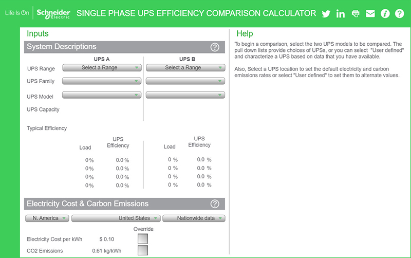 ระบบพลังงานและการทำความเย็นที่ออกมาในช่วงต้นของปี 2000 ไม่ได้ให้ประสิทธิภาพด้านพลังงานเหมือนระบบปัจจุบัน การรู้จักตัวแปรง่ายๆ บางประการ ก็จะทำให้คุณคำนวณการประหยัดพลังงานที่สามารถนำมาใช้เป็นเหตุผลสำหรับค่าใช้จ่ายในการอัพเกรดระบบได้ ตัวอย่างเช่น ตัวคำนวณค่าใช้จ่ายในการดำเนินการที่ทันสมัยสำหรับยูพีเอส 3 เฟส ของเรา สามารถเปรียบเทียบค่าใช้จ่ายของยูพีเอสของชไนเดอร์ อิเล็คทริค 1 ตัวกับยูพีเอสตัวอื่นภายในระยะเวลา 10 ปี เพื่อดูว่าสามารถประหยัดค่าใช้จ่ายการดำเนินการส่วนใดบ้าง โดยครอบคลุมเรื่องการใช้พลังงาน ค่าอะไหล่ การบำรุงรักษา และการเปลี่ยนแบตเตอรี่ โดยสามารถนำค่าใช้จ่ายมาใช้เป็นเหตุและผลทางธุรกิจ เพื่อหักลบกับค่าใช้จ่ายตั้งต้นสำหรับการซื้อยูพีเอสตัวใหม่ ซึ่งเรายังได้นำเสนอตัวคำนวณประสิทธิภาพยูพีเอสแบบเฟสเดียว และตัวคำนวณประสิทธิภาพยูพีเอสแบบ 3 เฟส ซึ่งจะให้ผลกระทบในแง่ของประสิทธิภาพการใช้พลังงานของยูพีเอส รวมถึงคาร์บอนฟุตปรินท์ อีกทั้งช่วยในการสร้างเหตุผลสำหรับความเป็นไปได้ทางธุรกิจเพื่อปรับปรุงระบบให้ทันสมัย และสำหรับยูพีเอสที่จำเป็นต้องเปลี่ยนแบตเตอรี่ใหม่ เราแนะนำให้พิจารณาการเปลี่ยนจากระบบควบคุมวาวล์แบบเดิมที่เป็นตะกั่วกรด (VRLA) ไปใช้แบตเตอรี่แบบลิเธียมไอออน ที่เล็กและเบากว่า อีกทั้งยังให้อายุการใช้งานที่ยาวนานกว่า โดยตัวคำนวณต้นทุนในการเป็นเจ้าของยูพีเอส แบตเตอรี่แบบ VRLA เทียบกับลิเธียมไออน จะช่วยประเมินการประหยัดค่าใช้จ่ายในส่วนต้นทุนการเป็นเจ้าของได้เป็นอย่างดี