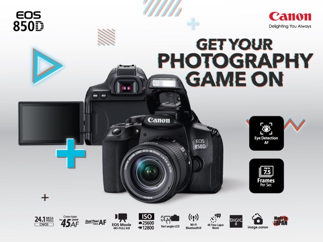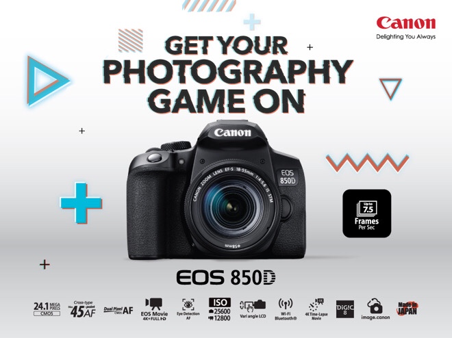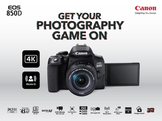 EOS 850D กล้อง DSLR สำหรับผู้ใช้งานกึ่งมืออาชีพ ซึ่งอัดแน่นมาด้วยฟีเจอร์ทันสมัยมากมาย รองรับการใช้งานที่หลากหลาย ทุกที่ ทุกสถานการณ์ มาพร้อมระบบออโต้โฟกัส Dual Pixel CMOS AF สามารถตรวจจับใบหน้าได้แม่นยำด้วย EOS Intelligent Tracking and Recognition Auto Focus (iTR AF) และบันทึกวิดีโอได้คมชัดระดับ 4K และราบรื่นไม่สะดุด พร้อมระบบป้องกันภาพสั่นไหวแบบอิเล็กทรอนิคส์ในตัวกล้อง เหมาะสำหรับผู้ที่ต้องการยกระดับฝีมือการถ่ายภาพจากสมาร์ทโฟนหรือกล้องชนิดอื่นมาเป็นกล้อง DSLR โดยนำหลายฟีเจอร์ของกล้อง DSLR ระดับกึ่งโปรมาไว้ในกล้องขนาดกะทัดรัดและราคาประหยัดกว่า ทั้งยังถ่ายภาพนิ่งและวิดีโอได้ดีเยี่ยม เป็นกล้องคู่ใจในการถ่ายภาพทิวทัศน์ หรือพกพาไปถ่ายภาพระหว่างเดินทางท่องเที่ยว เล่นกีฬา หรือทำกิจกรรมต่างๆ ในชีวิตประจำวัน