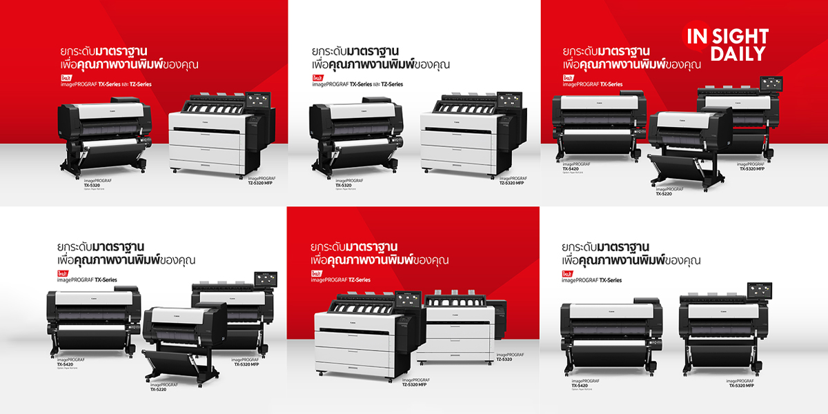 แคนนอน (Canon) แบรนด์ผู้นำด้านเทคโนโลยีอิมเมจจิ้งระดับโลก ประกาศเปิดตัวเครื่องพิมพ์หน้ากว้างรุ่นใหม่ทั้ง imagePROGRAF TZ-5320 series และ TX Series (รุ่น TX-5420/5320/5220) โดยมีทั้งพรินเตอร์หน้ากว้างแบบฟังก์ชันเดียวและมัลติฟังก์ชัน [1] เพื่อตอบสนองความต้องการด้านงานพิมพ์ที่หลากหลายในโลกธุรกิจวันนี้ โดยรุ่น imagePROGRAF TZ-5320 สามารถพิมพ์แบบก่อสร้างจำนวนมากได้อย่างรวดเร็ว ตอบโจทย์อุตสาหกรรมก่อสร้าง การออกแบบกราฟิก และธุรกิจรับพิมพ์งานตามสั่งที่ต้องการพรินเตอร์ความเร็วสูง ส่วน TX series มาพร้อมฟีเจอร์การพิมพ์ที่หลากหลาย ครอบคลุมทั้งการพิมพ์แบบก่อสร้าง โปสเตอร์ และบอร์ดประกาศขนาดใหญ่ ให้คุณพร้อมรับงานใหญ่ทุกสเกลได้อย่างมั่นใจ