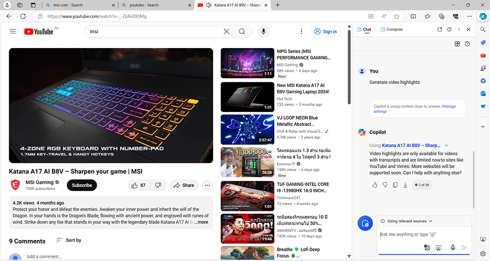 รีวิว Copilot ผู้ช่วย AI อัจฉริยะบน Windows 11 ที่ทำงานบน MSI Katana A15 AI B8VF เล่นเกมก็แรง ทำงาน AI ก็เร็ว!