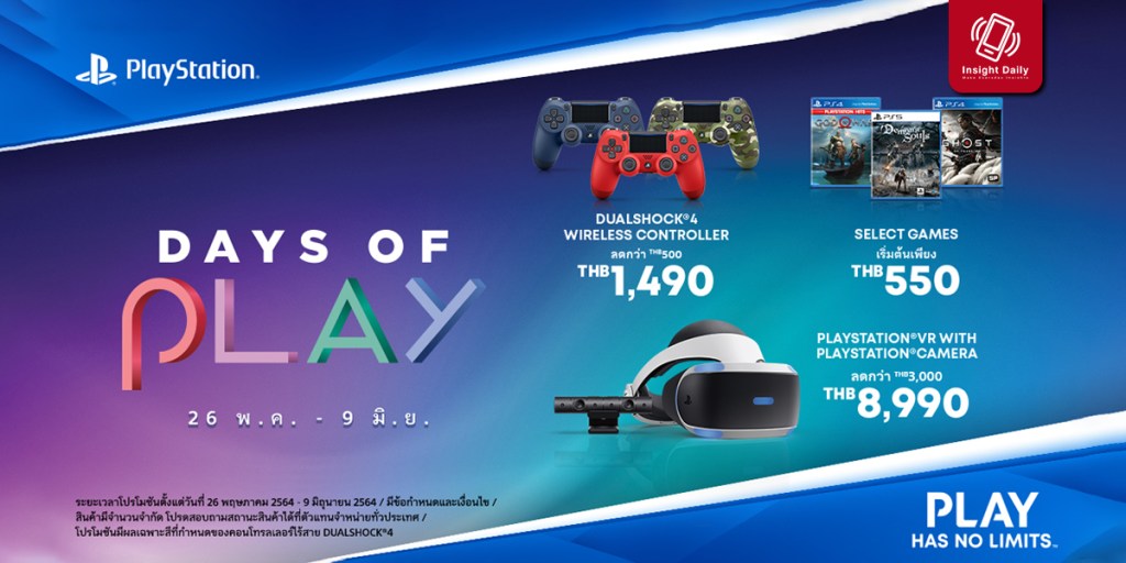 โซนี่ อินเตอร์แอคทีฟ เอนเตอร์เทนเมนต์ สิงคโปร์ ประกาศโปรโมชั่นพิเศษ “Days of Play” เริ่มวันนี้ – 9 มิถุนายน 2564 นี้ เฉลิมฉลองไปกับคอมมิวนิตี้ PlayStation ที่ยอดเยี่ยมและขอบคุณแฟน ๆ ทั่วโลก โดยกิจกรรม Days of Play นั้น เป็นกิจกรรมประจำปีที่จัดขึ้นทั่วโลก ปีนี้จัดขึ้นเป็นปีที่ 5 มาพร้อมข้อเสนอสุดพิเศษสำหรับผลิตภัณฑ์ของ PlayStation และเกมต่าง ๆ ทั้งในส่วนของร้านค้าตัวแทนจำหน่าย PlayStation® Authorized Dealers และร้านค้า Sony Stores ทุกสาขา จนกว่าสินค้าจะหมด